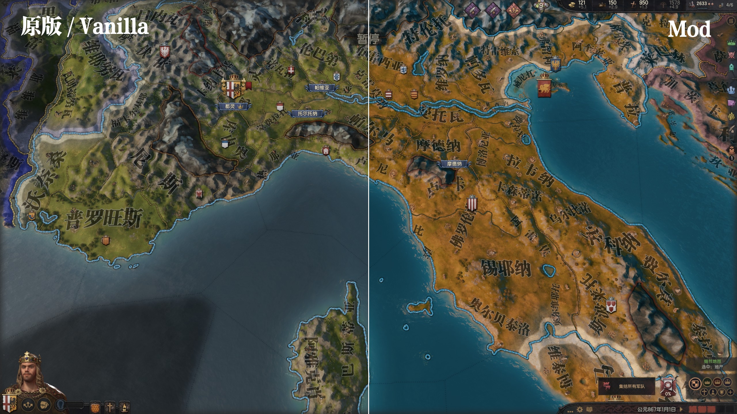 秋季地图配色,金黄的大地和蓝蓝的海。 🏆 兼容铁人模式和成就。 如果你看腻了原版绿油油的地形颜色,不妨来试一下这个mod! Experience an autumn-inspired map color scheme featuring a golden landscape and a serene blue sea. 🏆 This mod is fully compatible with Ironman mode and allows achievements. If the original game’