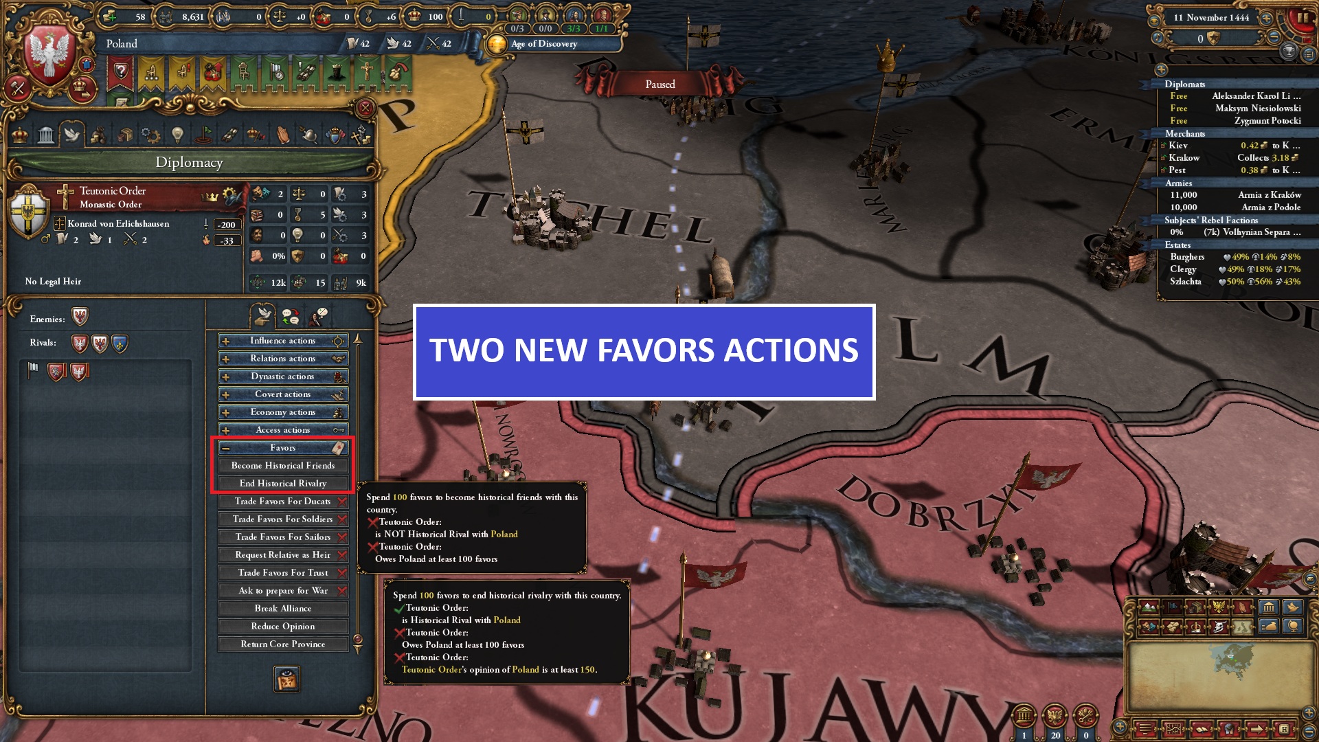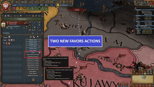 This simple mod adds options to become historical friends/end historical rivalry in exchange of 100 favors. Two new options: Become historical friends – for countries that aren’t historical rivals/friends and have 100 favors to spend End historical rivalry