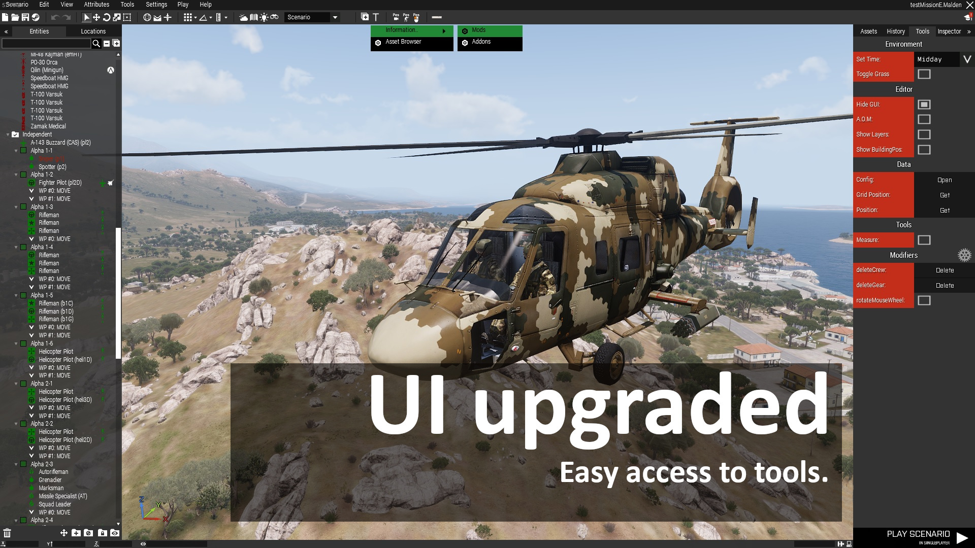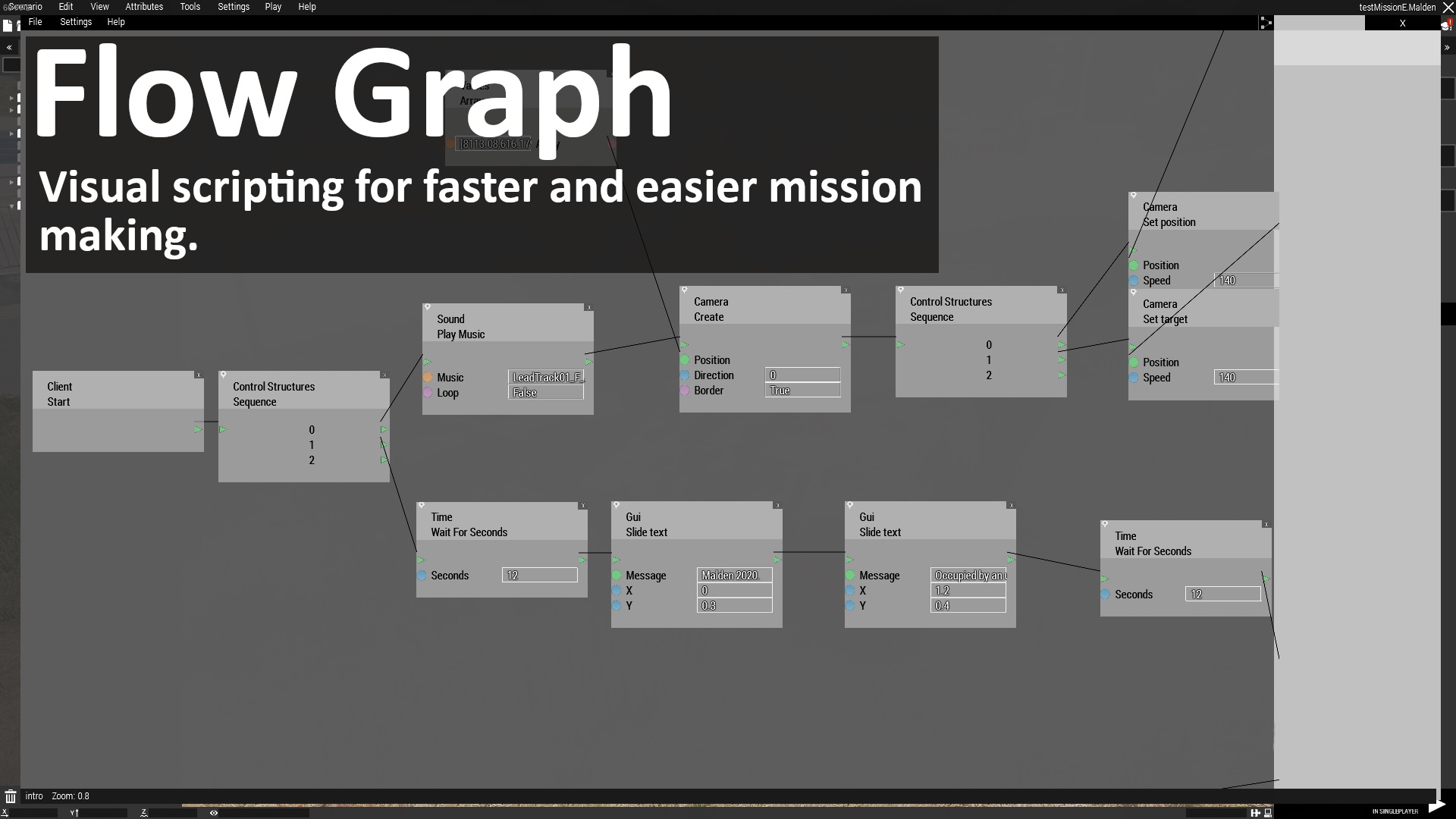 Introduction Eden just got upgraded. Now with inspector view, easier access to tools. With this flowgraphs are introduced. Visual scripting that you can use to create advanced missions/systems. This project goal is to update eden to become a better editor.