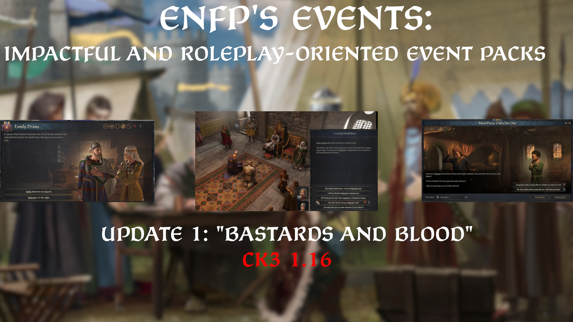 Updated for current CK3 version: 1.18 (This mod will never become incompatible with an update unless it fundamentally changes how events work.) This mod adds various events to Crusader Kings III with the simple goal of incre