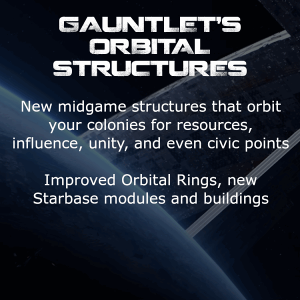 Welcome to Gauntlet’s Orbital Structures! The purpose of this mod is to bring you more megastructures, generally built around your colonies and generally during the mid-game, additionally this mod increases the maximum level of your Orbital Rings. ORBITAL