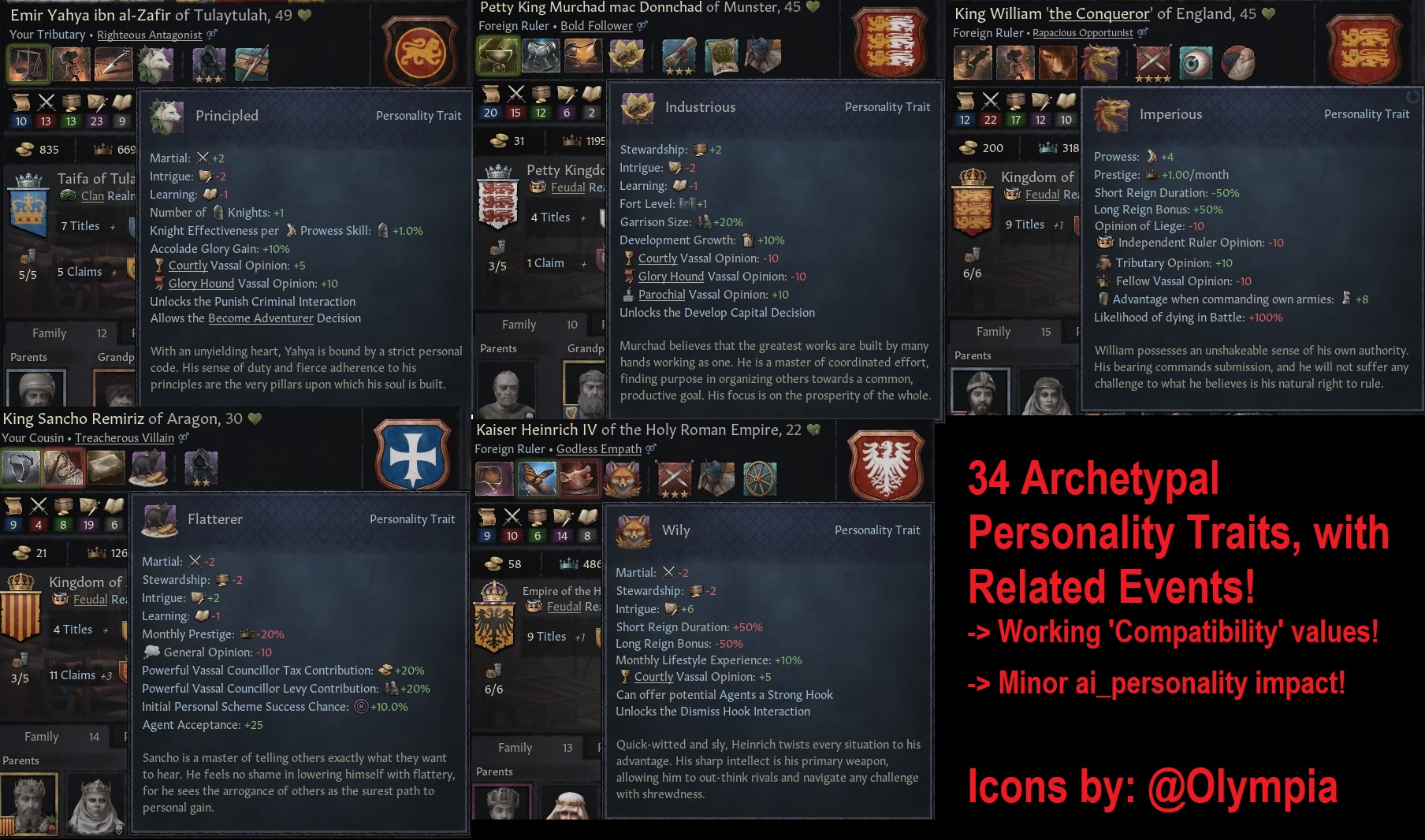 Introduction Immersive Personalities is a robust event pack (better than Coronations at least lol) that aims to make character personalities the heart of your Crusader Kings 3 story. This mod breathes life into every