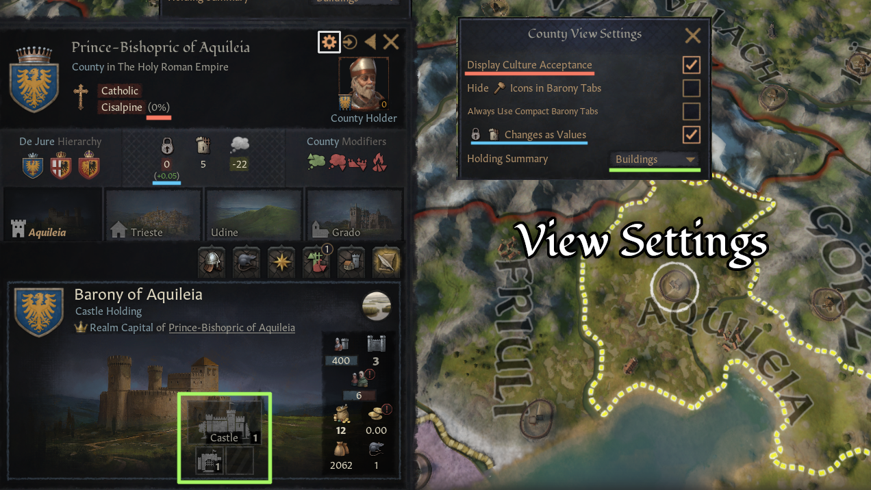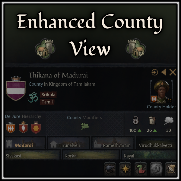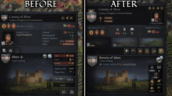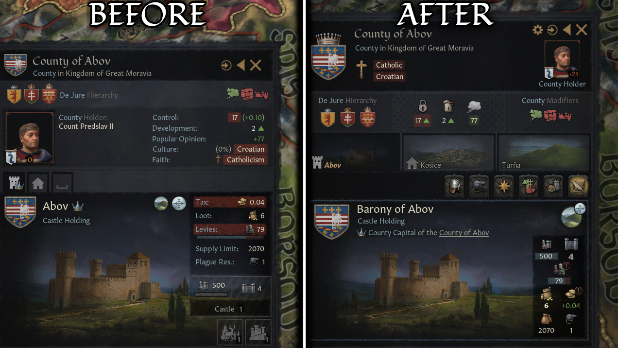 The county view wasn’t to my taste (no icons for stats, holding view getting busy especially the modifiers grid) so I made my own version. Features • Different look for the county UI • County and Holding stats shown with icons instead of text labels • Coun