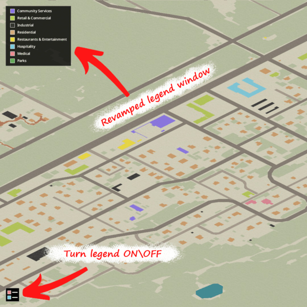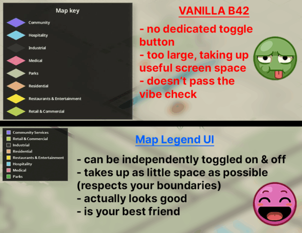 Works with Build 42! Playing build 41, but still don’t remember what all the building colors stand for? Or, perhaps, like me, you think that the vanilla build 42 map key looks a bit… off? Suffer no longer. This mod adds a legend from old town maps to in-