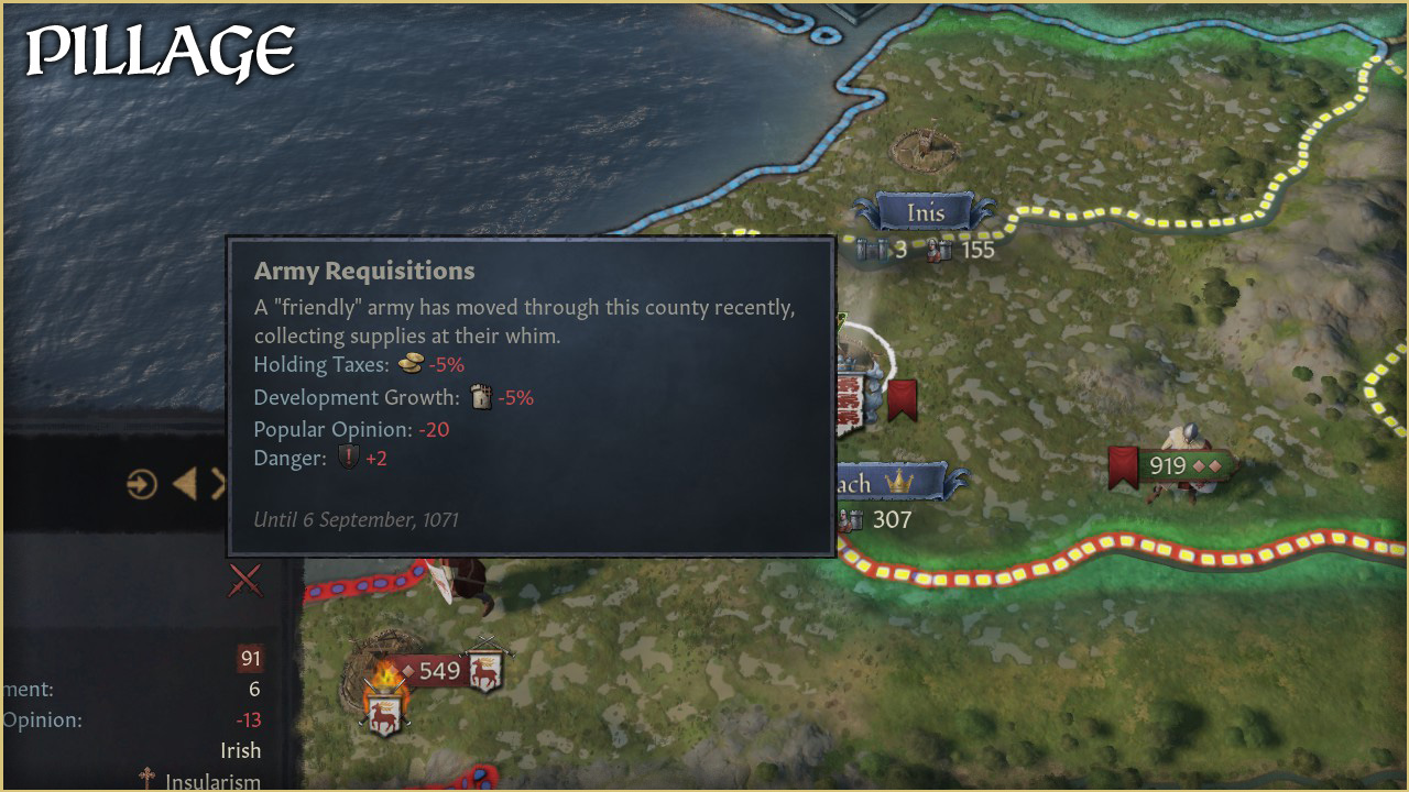 Pillage for Crusader Kings 3 1.18.* The march begins. Out in front are the scouts and incendiaries. After them come the foragers whose job it is to collect the spoils and carry them to the great baggage train. Soon all is tumult. The peasants, having just