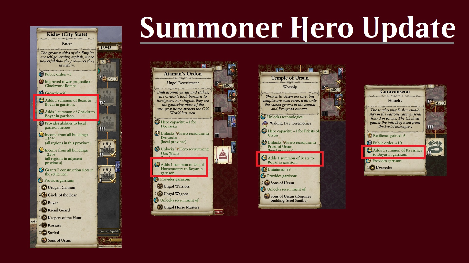 Now with SUMMONER HEROES update! What this submod does Gives Kislev: Reborn the Reporting For Duty treatment! ○ Awards troops to the garrison for Kislev military buildings, the town pub (kvass!), and landmarks. ○ Gives spells and abilities to your garrison