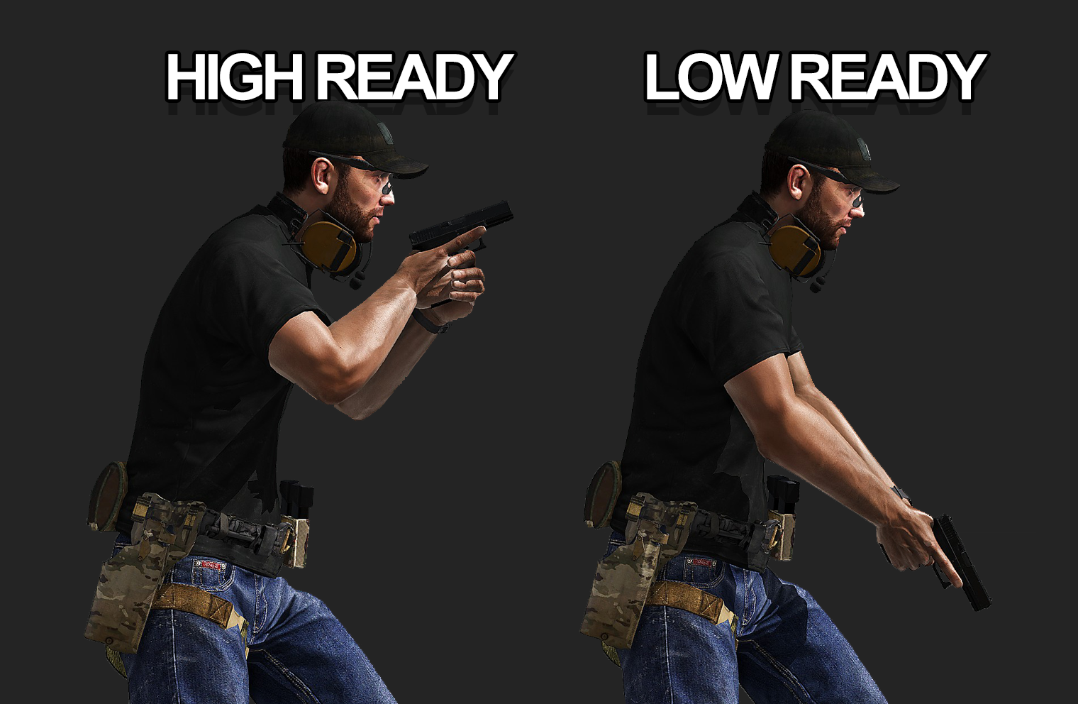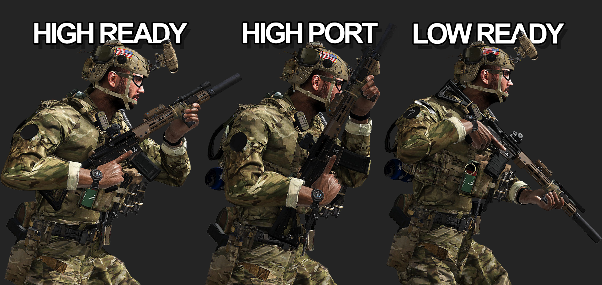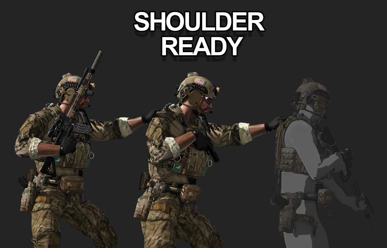 Features – High Port, High Ready, Low Ready (Rifle, Pistol) – Shoulder Hand Raise (When you are behind an ally in a ready stance, you can raise your hand or stick to them.) – Weapon obstacle avoidance (depending on the length of your weapon, you may trigge