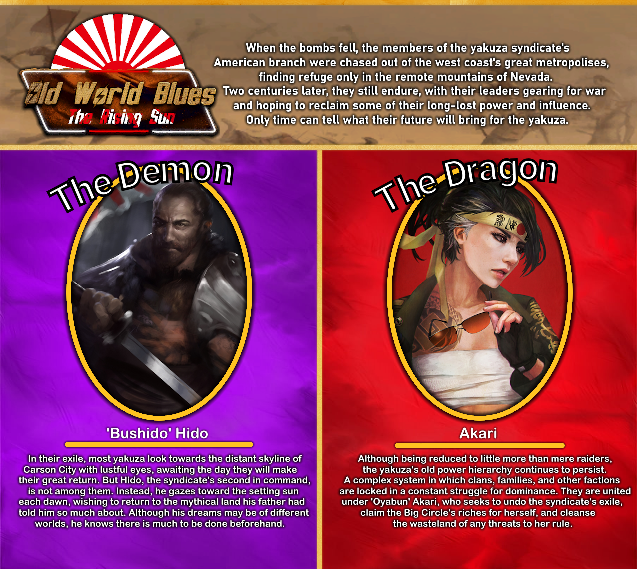 Old World Blues – The Rising Sun When the bombs fell, the members of the yakuza syndicate’s American branch were chased out of the West Coast’s great metropolises, finding refuge only in the remote mountains of Nevada. Two centuries later, they still endur