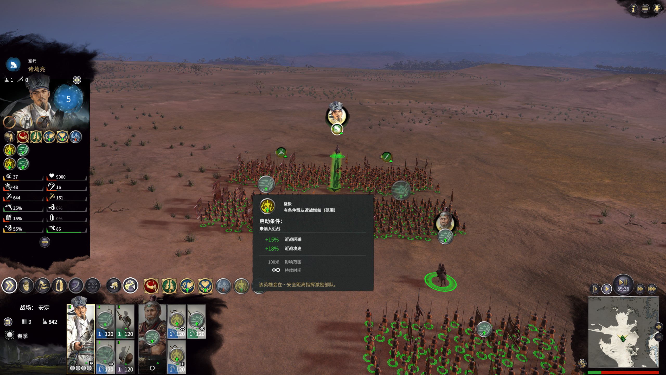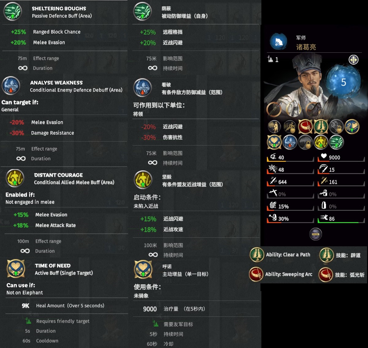 Zhuge Liang will receive 6 skills from Dynasty mode. Supportive skills mostly with healing and army buff +2 classic offensive skills. See the first picture for detailed skill list. Works in custom battles too, no need for new save game, can be turned on an